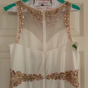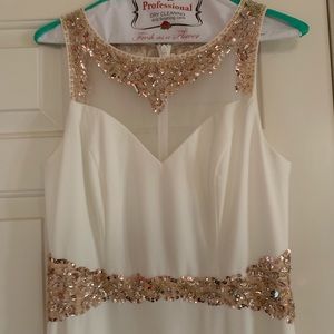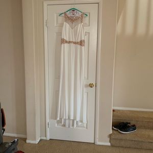 Long off white prom dress with mesh backing and rose gold detail on front and back. Dress has a small train meaning it’s a little longer in the back! Worn once by my daughter to prom last year and I just had it dry cleaned! No stains or tears, non smoking home. Offers welcome.