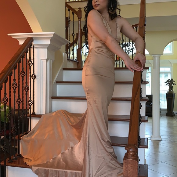 This is a champagne mermaid prom dress! This is a size S, but i am usually around a size 4-6. The straps are adjustable & it is tight fighting
