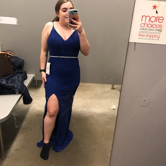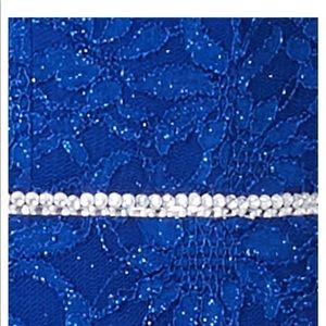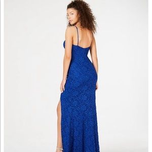 Long royal blue lace prom dress with slit