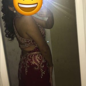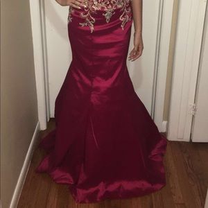 Only worn once to my senior prom! Very beautiful and comfortable dress. It is red with gold open from the back with a nice design. It is in perfect conditions! NO RIPS, TEARS OR STAINS. Does not come with tags or receipt! Feel free to send offers.