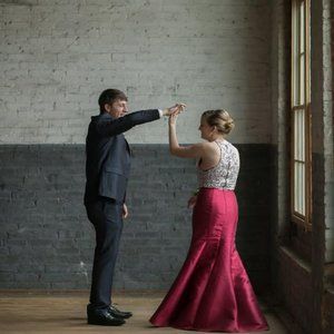 Ruby red prom dress in brand new condition. Worn only for pictures, never made it to prom. Beautiful rhinestone covered top!