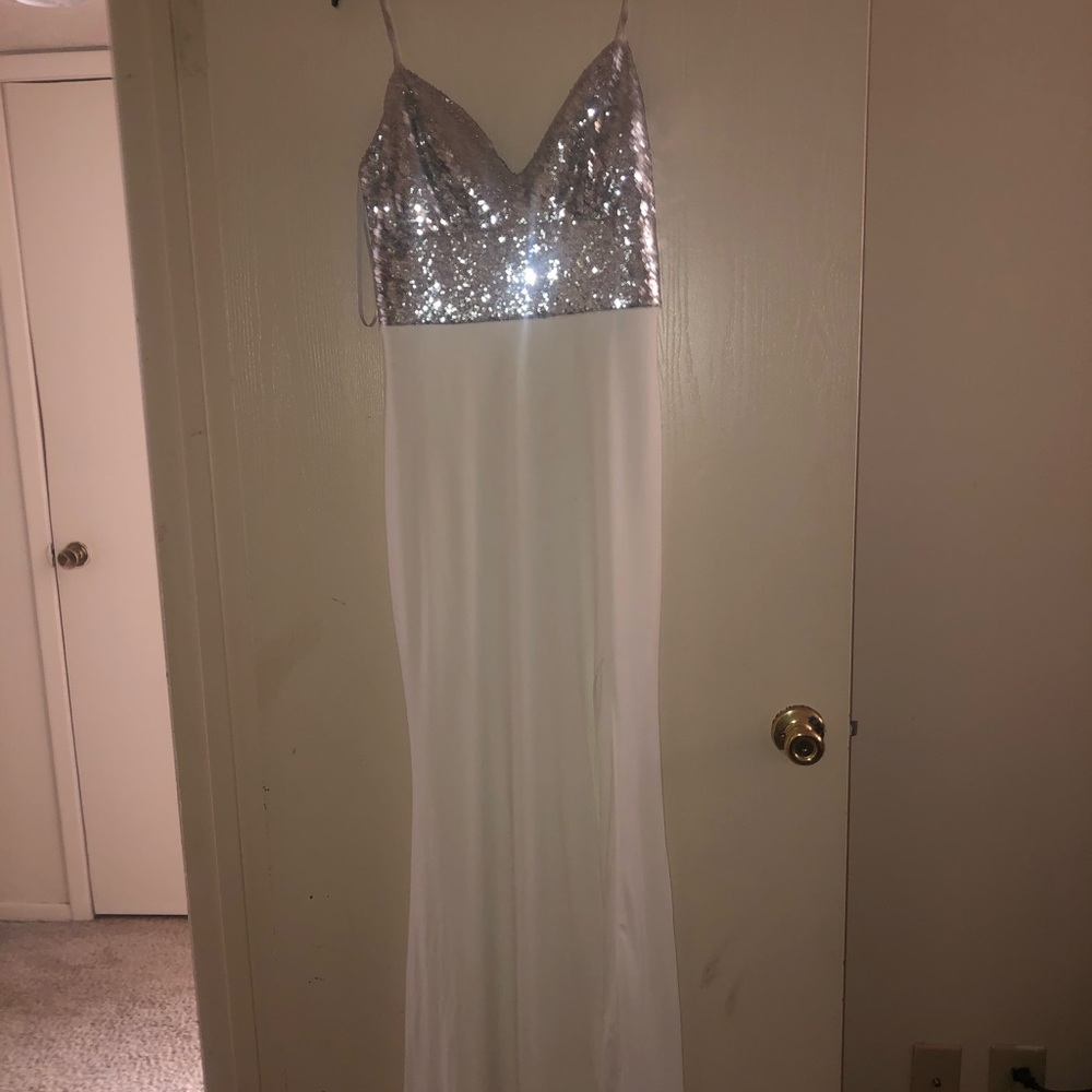 Size 11. Very comfortable fit! Silver sparkle prom dress with a leg opening
