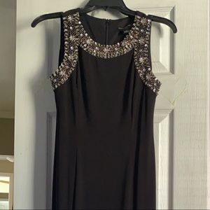 a black prom dress from ignite evenings new york. detailed neck line, with slit on left side,back of dress is all closed.