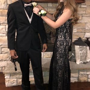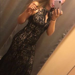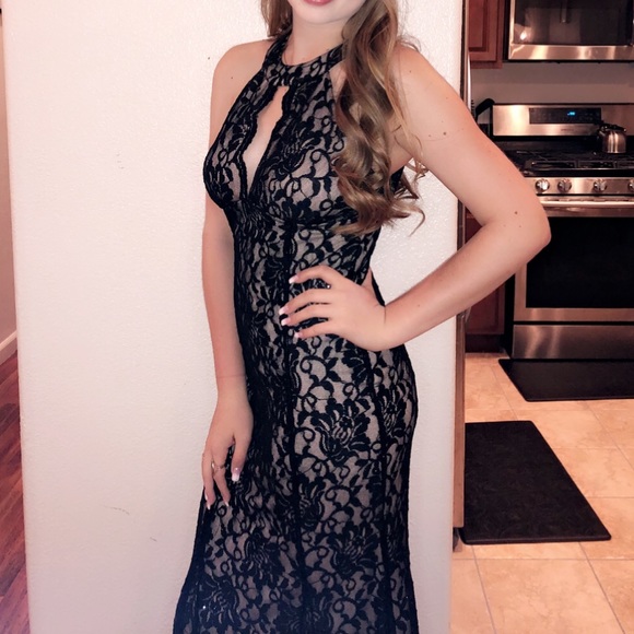 Black lace prom dress, nude lining underneath, hint of sparkle , chic, long , prom, WORN ONCE, PERFECT CONDITION