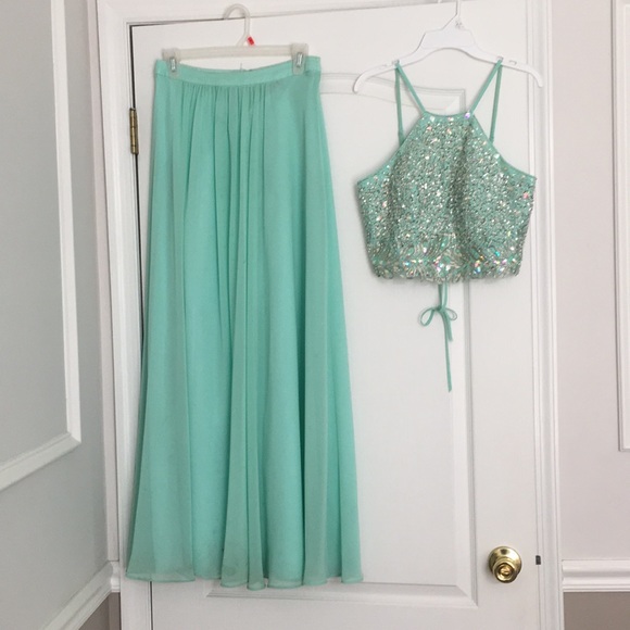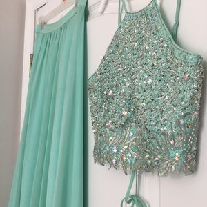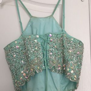 two-piece, mint green, dress with silver rhinestones, and fabric design. halter top, with lace up back.
