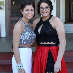 Very elegant and beautiful red and black prom dress the skirt of the dress is a deep red and underneath a built in black sequins skirt the top is a beautiful black sequins only worn once