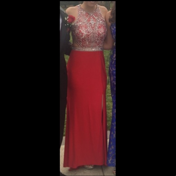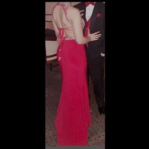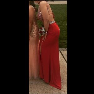 This red dress is completely open back with laces to tie in the back. It is beaded with rhinestones on the top and has cups on the inside. There is a slit on the left that comes a little less than halfway up my thigh (I am 5’3” and wore about 4 inch heels).