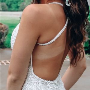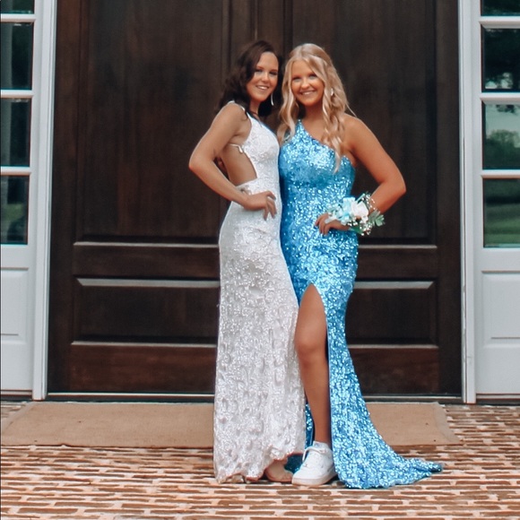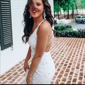My favorite dress ever. Open cross back white prom dress. Altered to fit heights 5’2” - 5’7” medium sized leg slit and makes figure look really good. Size 0 but can fit 0-4. Not dirty. Worn twice.