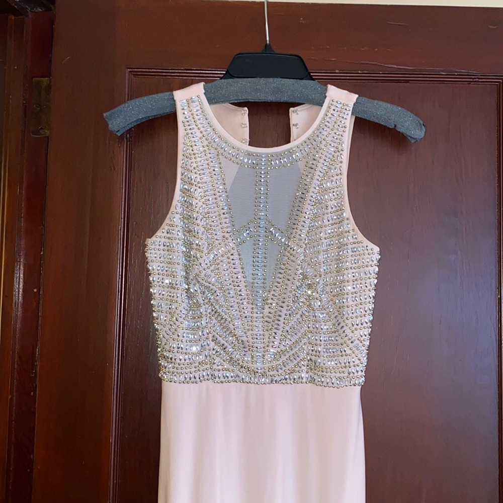WORN ONCE pink maxi prom dress. jersey material on bottom with mesh and gold/ silver sequin top