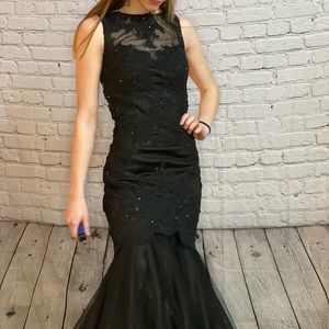 Size 0, 32B bra size, 25" waist, 5'2". Gorgeous black sequins, mermaid, low cut back.