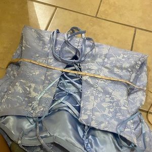 Bust is about 16 laying flat but could go an inch or so smaller or bigger by tightening/loosening corset top