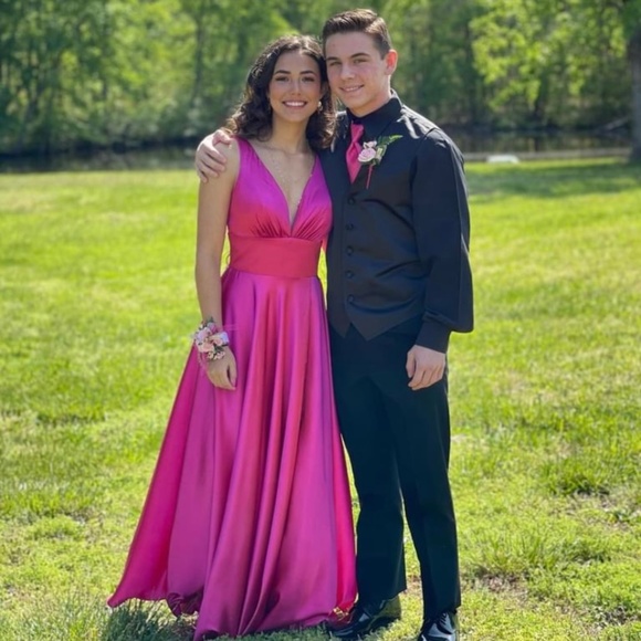 A fuchsia a-line prom dress with deep V. I am 5’2 and wore 3” heels. Alterations were made to sinch the waist in but it can be reversed.