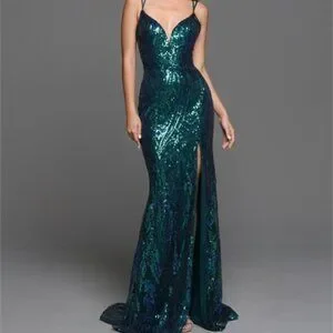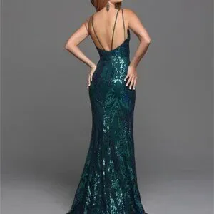 Green fit and flare sequin prom dress with low back and sweep train.