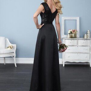 Elegant two-piece bridesmaid dress featuring a sequin cap sleeve mini dress and removable split overskirt that changes it to an A-line.