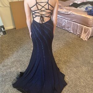 Sparkling navy gown with blue glitter swirl details. Spaghetti straps and a fitted bodice. High front slit for dramatic movement. Sleek, flattering silhouette for formal occasions.