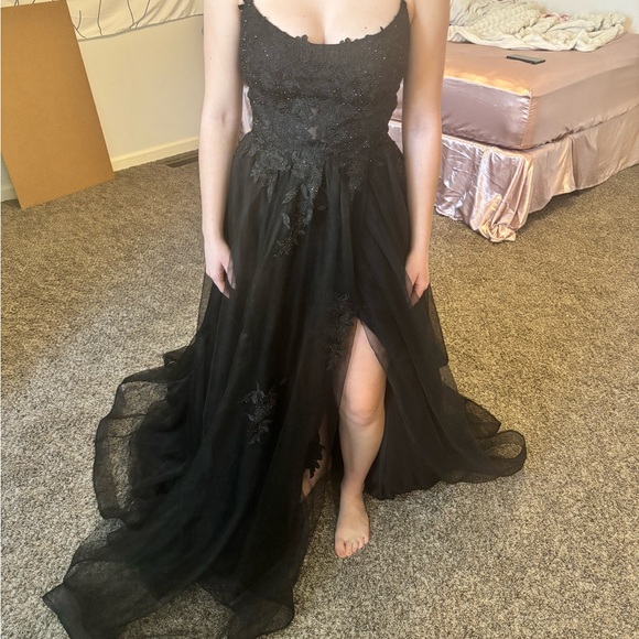 Elegant black evening dress with delicate lace appliqué and a flattering scoop neckline. Lightweight layered skirt with a tasteful front slit for movement and style. Perfect for formal events and special occasions.