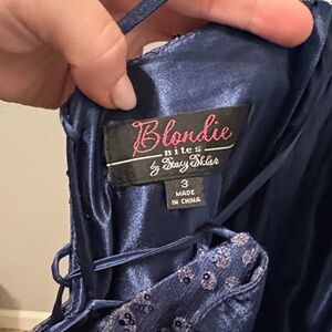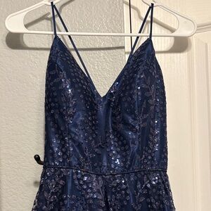 Elegant navy blue dress with vine like sequin embellishments. Spaghetti straps that adjust and fitted bodice. Corset tie back. Perfect for prom night.