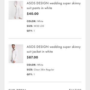 ASOS DESIGN White skinny suit jacket and pants, worn one time for High School Prom. Perfect for prom/homecoming/wedding/any special event. Pants size 30-30 and Jacket Size 38 Regular