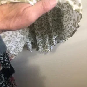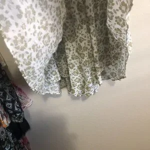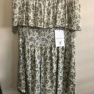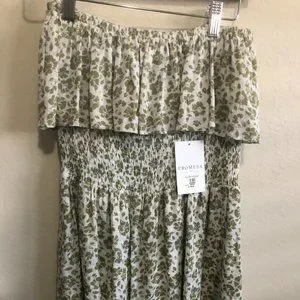 THIS ROMPER IS SIZE S. IT IS STRAPLESS, AND THEIR IS A SKIRT OVER THE BOTTOM OF ROMPER,