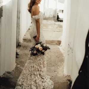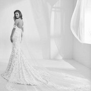 The perfect dress. I wore this gown in Greece for my wedding and it is even more beautiful in person. Meticulous beading throughout, a custom beige lining underneath to give the gown a tiny bit of contrast, a breathtaking train and a veil that hooks to the back of the dress, not your head, so your hair stays perfect but you still feel like a queen. The dress has been cleaned, it's a fitted style. I have a smaller upper body (32C) but larger hips/butt, so great for smaller figure to tailor.