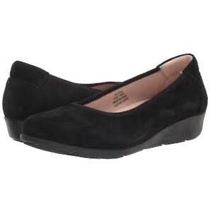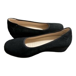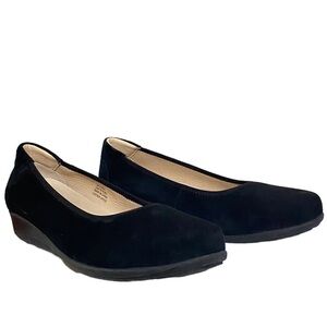 Women’s Luxury Black Suede Leather Upper Slip on shoes with a low 1” Wedge shoes. Removable & replaceable insoles. Worn 2x