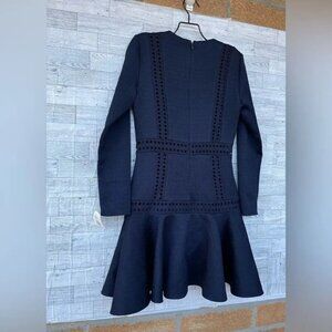 Retail $558 . A-line Crew Neckline Long Fitted Sleeves Above the Knee Slimming Embroidered Detail Ruffle Skirt