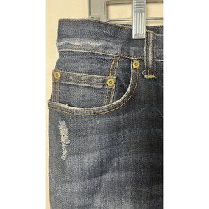 PRPS RAMBLER JAPANESE DENIM STRAIGHT LEG JEANS IN A MARKED SIZE 33. THE JEANS HAVE FACTORY DISTRESSING THROUGHOUT, BUTTON FLY, SLIGHTLY TAPERED STRAIGHT LEG, MID RISE IN A DARK INDIGO.