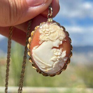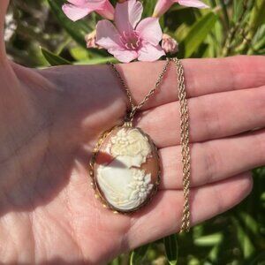• Truly Beautiful Vintage 1950s “PR.ST.CO 1/20 12K GF” Hallmarked Hand Carved MOP Cameo 12K Gold Filled Locket Necklace