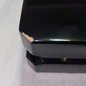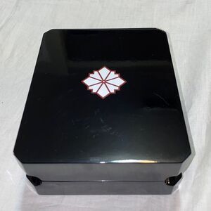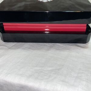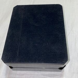Black veneer exterior with white and red logo, red meddle detail, white interior padded lining with gold lettering. Removable insert for a necklace. Measures 6” x 5” x 2.25”. Small chip on the corner (see picture) but otherwise excellent condition.