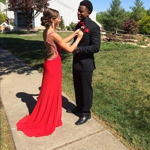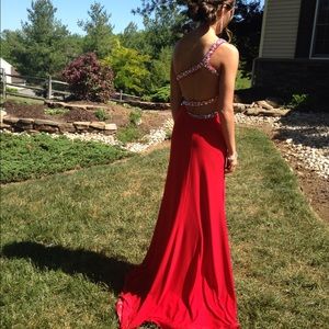 Red prom dress one shoulder with a beautiful open back. Loved this dress fit so nicely and so elegant. Size 1/2 brand clarisse