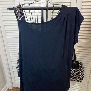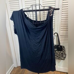 A absolutely stunning black top with beaded shoulder. It doesn’t have a fabric tag but it feels like the softest stretchy tee you could imagine 😊