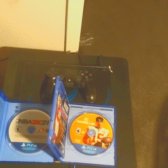 It has light blue flames on it and the top of the PlayStation is black and the controller is black and I have two games NBA 2K 21 for PS4 Madden 20 for PS4