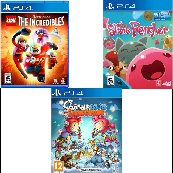 This bundle includes three games: Lego: The incredibles, Slime Rancher, and Scribblenauts Showdown. All three games are rated E for everyone. Lightly used.