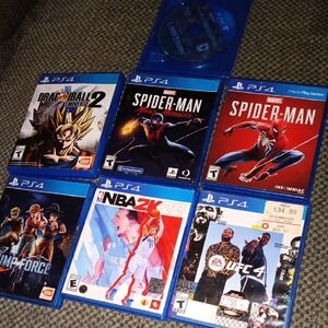 Collection of 7 Sony PS4 games. Includes popular titles in blue cases. Perfect for gamers. Minecraft, Dragon Ball Xenoverse 2, Spiderman Miles Morales, Spiderman, Nba2k22, Jump Force, UFC 4.