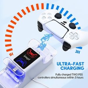 Dual Charging Station is built-in with dual Type-C charging ports, it can quickly charge two PS5 devices at the same time to create the ultimate experience of uninterrupted play. It will take about 1.5 hours to charge a controller, and two controllers can be fully charged simultaneously in 3 hours. (Charge time will vary depending on power source).