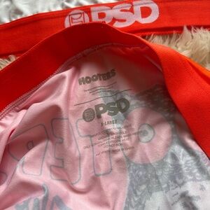 White and orange sports bra and shorts by PSD. Features bold Hooters logo.