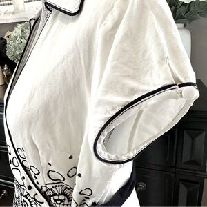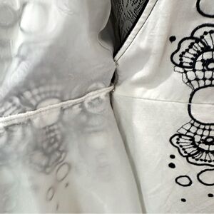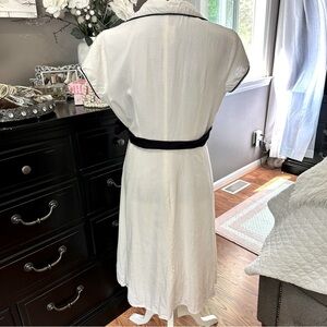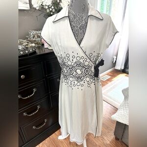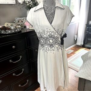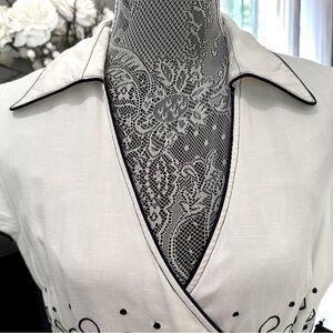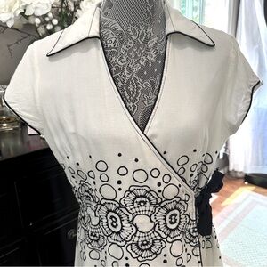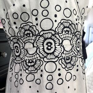 This 2008 vintage-inspired PS…Style dress features a crisp ivory base with striking navy floral embroidery and dotted accents that wrap around the waist for a flattering silhouette.
