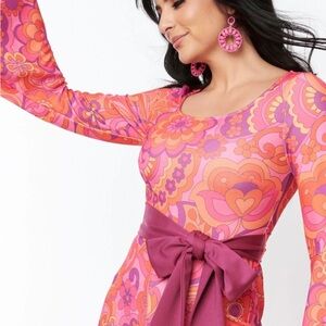PINK psychedelic print, long sleeve, bell bottom jumpsuit back zipper.