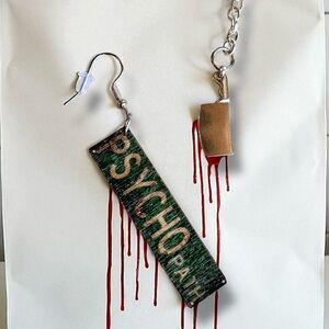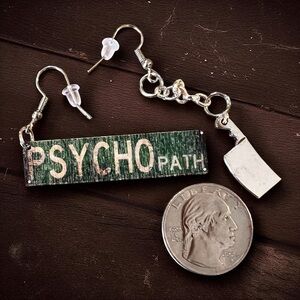 PSYCHO PATH Earrings with cleaver charm Fun Halloween Goth True Crime lover PSYCHO PATH Earrings Fun Halloween Goth True Crime lover Great gift Funny Unique earrings with fun text. Perfect for making a statement. Great Halloween earrings. Size see picture with US quarter. Back of earrings are cream colored. Hypoallergenic. Resin. Stainless steel cleaver.