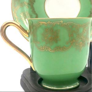 This very pretty demitasse cup and saucer is a pretty sea green color with gold designs. The inside of the cup has a lovely floral design, viewed as the holder takes a sip.