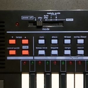 The Casio PT-80 1980's home keyboard is small with mini keys and has mainly analogue sounds for rhythm and voices. The auto-accompaniment comes in the form of chord and bassline. the small additional chord keyboard section allows single-finger chords to be played. This Casio comes with ROM packs containing preset songs. It has a melody guide function and key lighting LEDs as a teaching aid.