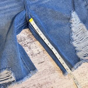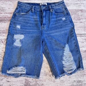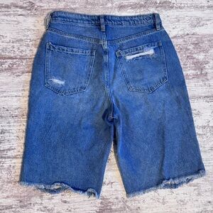 Trendy distressed denim shorts. Features a classic blue wash. Perfect for casual wear.