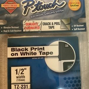 This is a BRAND NEW PACKAGE of Brother P-Touch label tape. It is 1/2" x 26.2 feet. You use this tape with all P-touch Electronic System machines that use 1/4", 3/8", and 1/2" wide TZ tapes. This is a BLACK PRINT on WHITE TAPE. I have other new and used rolls listed separately. Please see all pictures. If you have any questions, please ask before purchasing.