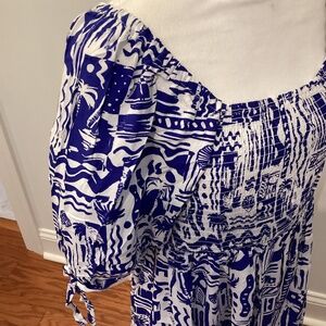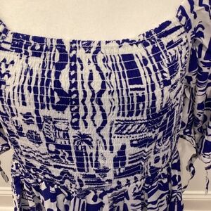 PUFF SLEEVE RESORT PRINT DRESS (Color: Blue/ White)
