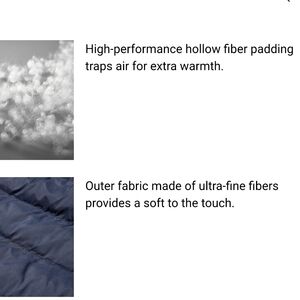 ⁃ Hollow fiber padding retains warmth with minimal bulk.