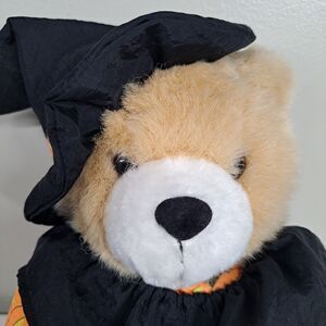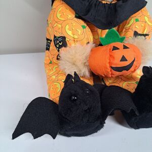 PUFFY Halloween Bear Plush Toy wearing Pumpkin & Cat PJs, a Witches Hat, Bat Slippers, and holding a Pumpkin. ADORABLE!