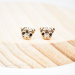 Description: Adorable small pug antique gold color stud earrings with crystal eyes NEW, Boutique Item Material: metal, crystal Insta: @OrnamentalStone Smoke free home Minimal packaging and recycled when possible Tags: gift, jewelry, statement, unique, special, holiday, fall, vacation, doggy, puppy, pup, dog, animal REF#J1 Photos © Ornamental Stone LLC 2019