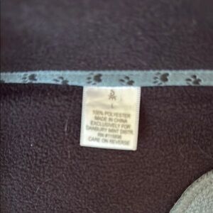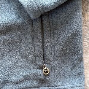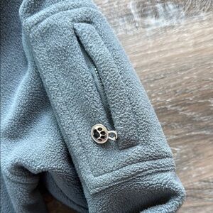 Cozy gray fleece jacket featuring an embroidered dog design. Full zip with pockets. Full line of embroidered dogs along back shoulder. Cinch available at waste and upper sleeve pocket absolutely adorable.