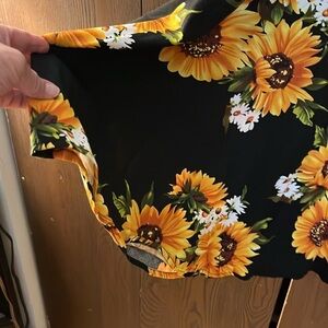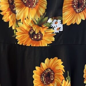 PUKAVT capped sleeved black dress with large sunflowers and daisies. Flared skirt. Scoop neck. Zippers in the back. The length measures 39 inches and the waist side to side measures 14.5 inches. Size Medium.