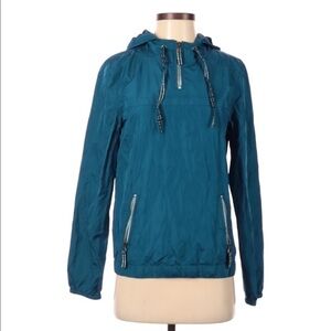 Lightweight pull over dark teal hooded wind breaker great for working out or lounging 100% polyester